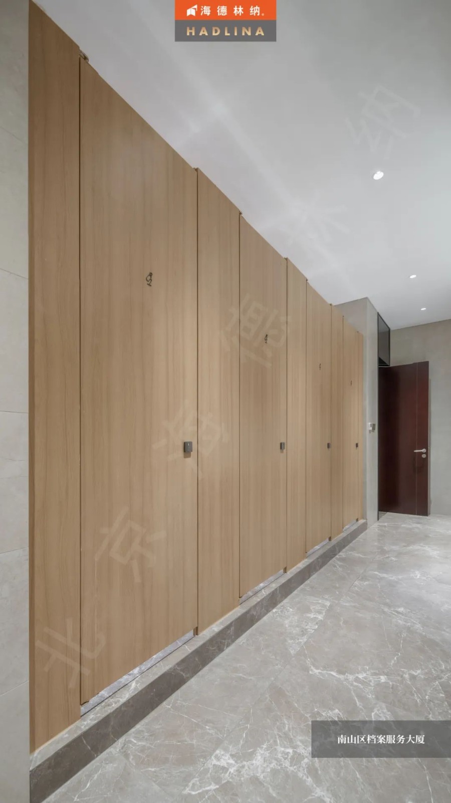 深圳檔案大廈衛生間隔斷系統選用的是海德林納?HD-5款式,其獨特的原木色花紋,猶如一幅自然之美的畫卷,與空間相得益彰,為使用者帶來舒適和美好。26mm的厚度,以精湛工藝打造,展現出別具匠心的設計。獨特的材質賦予門體優異的防撞擊性能,而且具有優異的耐腐蝕特性,能延長使用壽命,確保其長久美觀。同時,此隔斷為國家A級防火,能有效隔絕火源,保護整個空間的安全。