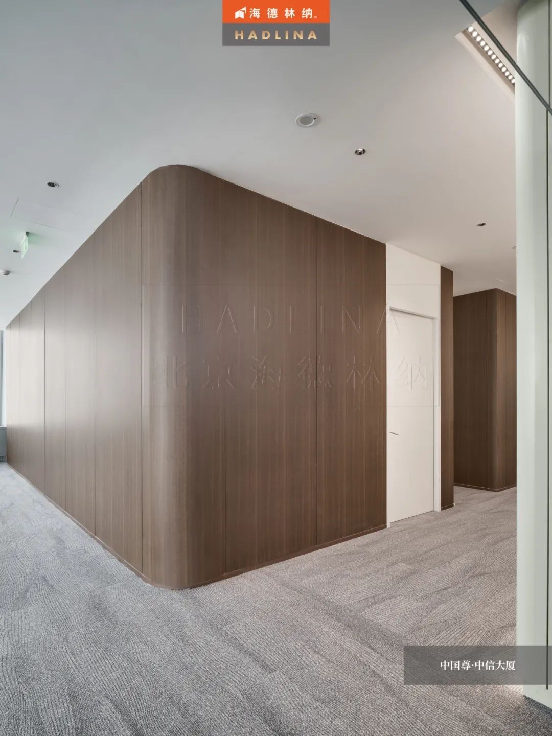 中國尊/中信大廈裝配式掛墻系統主要選用海德林納?木紋/布紋為主要顏色,將色彩與空間完美結合,給人帶來一種溫暖、自然的感受。色彩的選擇與搭配讓整個空間更加和諧統一,營造出舒適宜人的氛圍。為人們提供了愉悅的視覺享受,讓人沉浸在自然的溫暖與寧靜之中。
