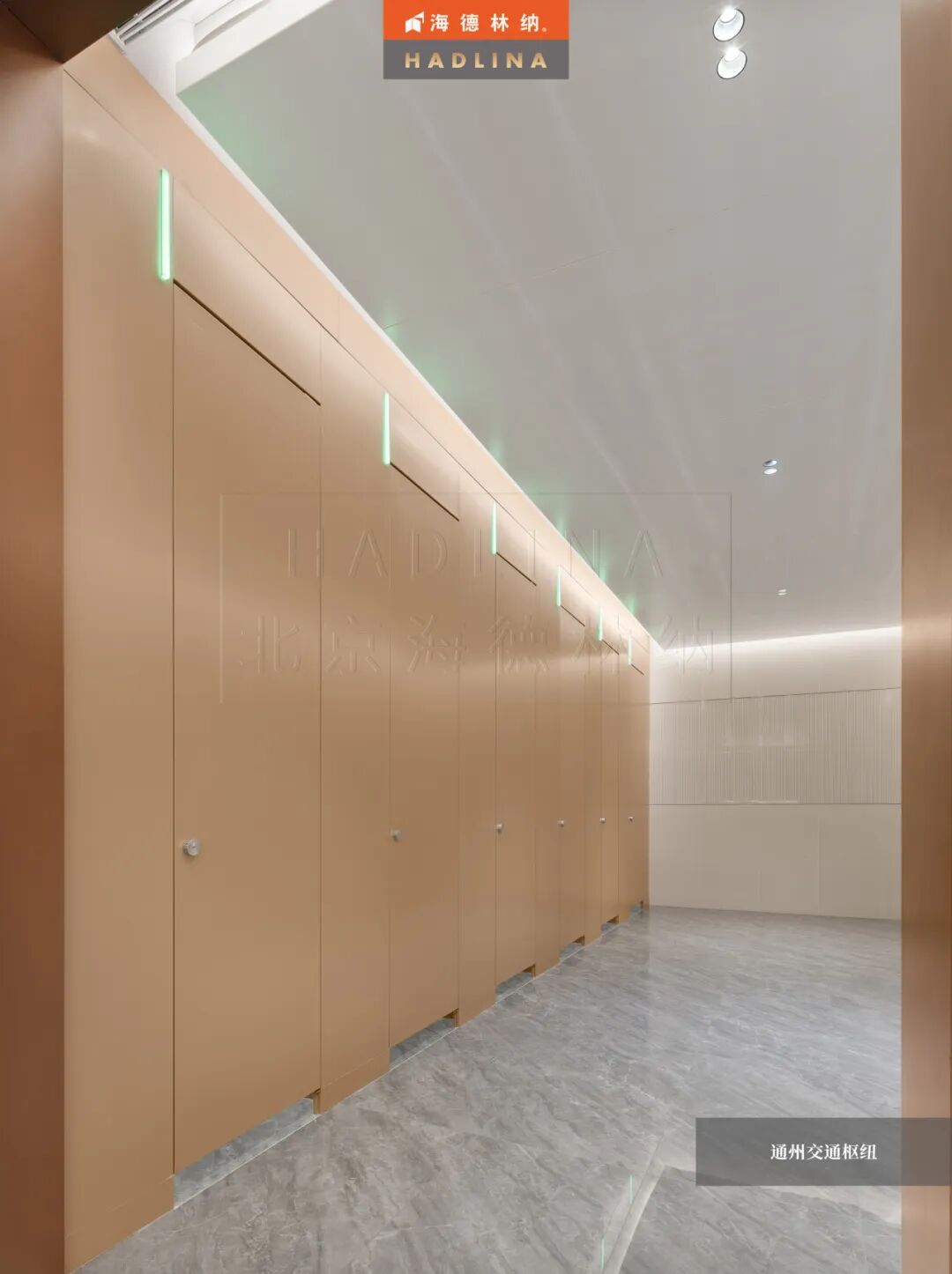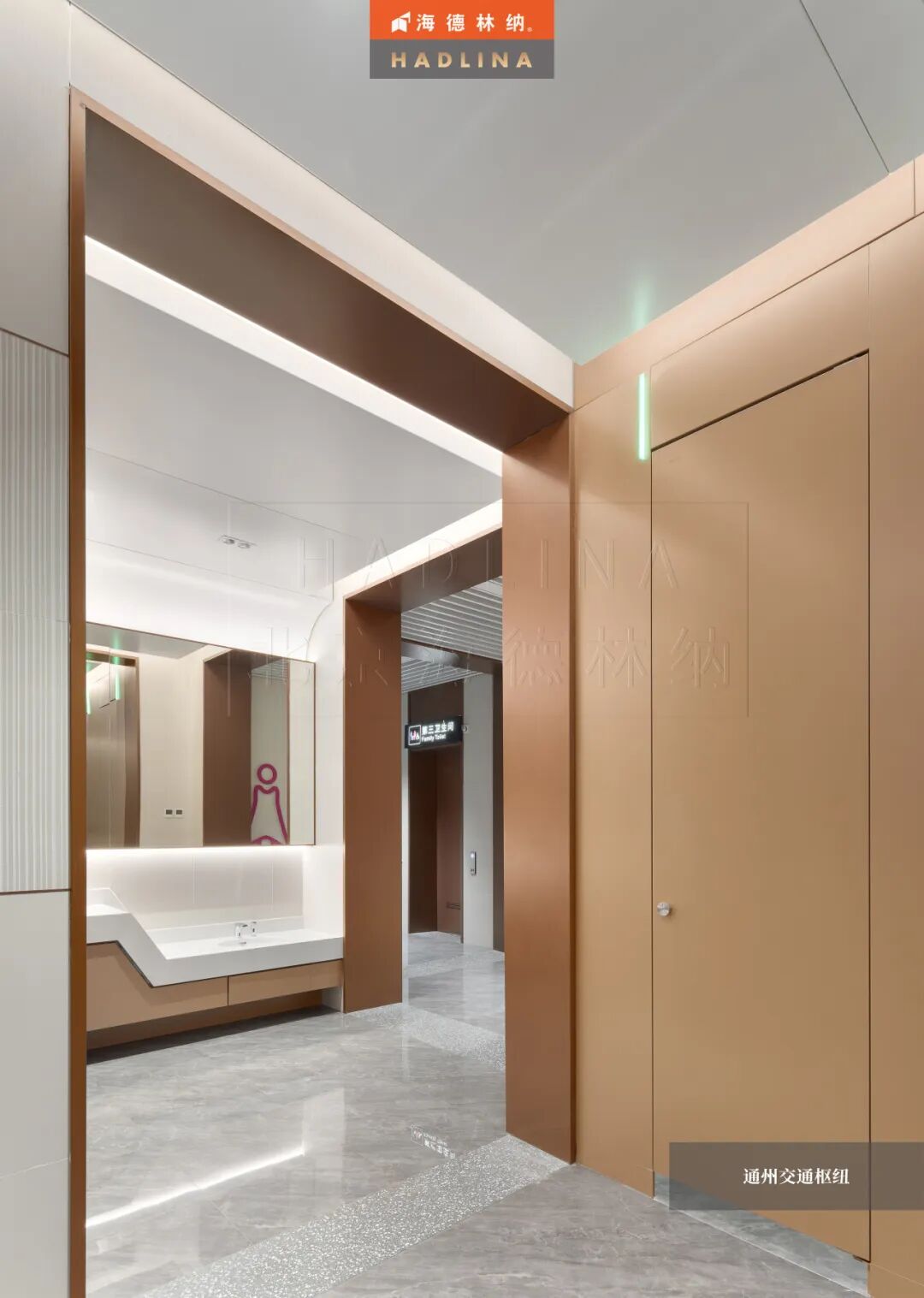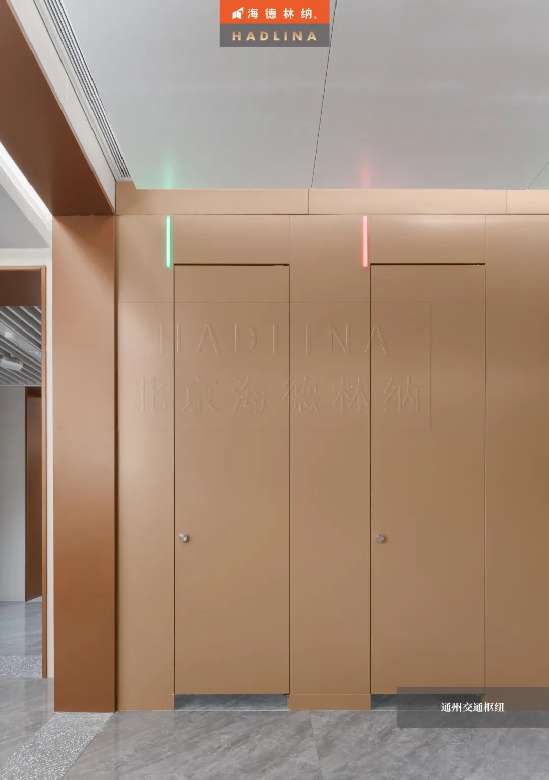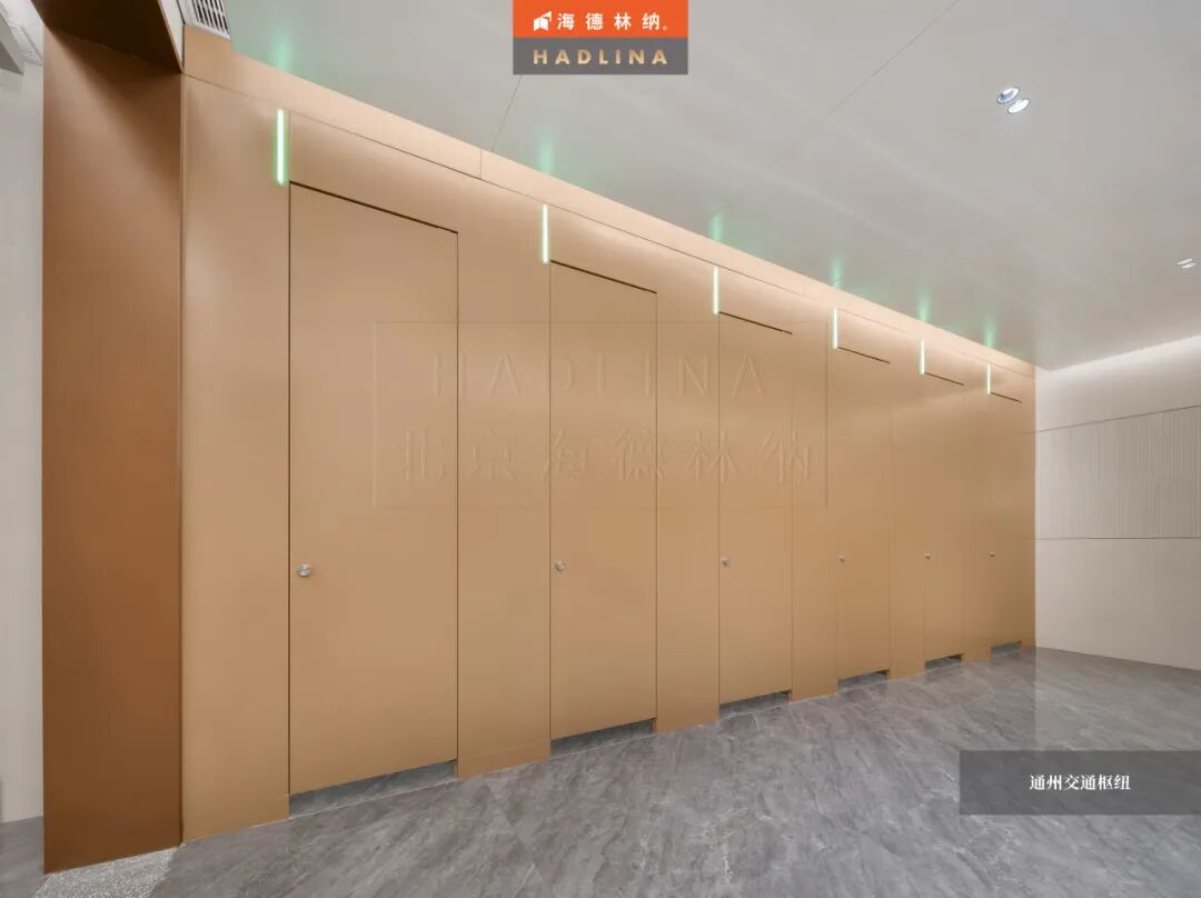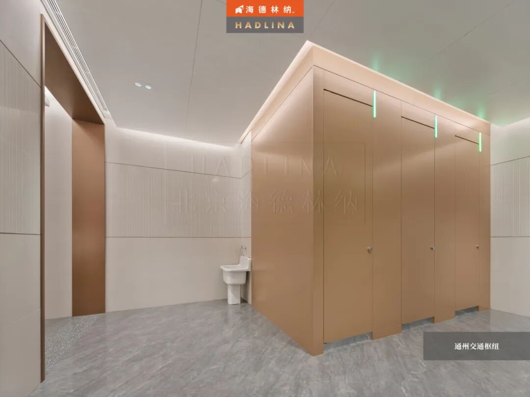 在此次通州交通樞紐項目中,海德林納?很榮幸為其公共衛生空間提供了定制化的隔斷系統解決方案。項目采用天地式安裝方式,確保隔斷在高人流環境下的穩固與耐用。26mm厚鋁蜂窩復合板材,子母口邊型與暗連接工藝相得益彰,讓每一塊板材之間的銜接如絲般順滑,呈現出渾然一體的視覺美感性。